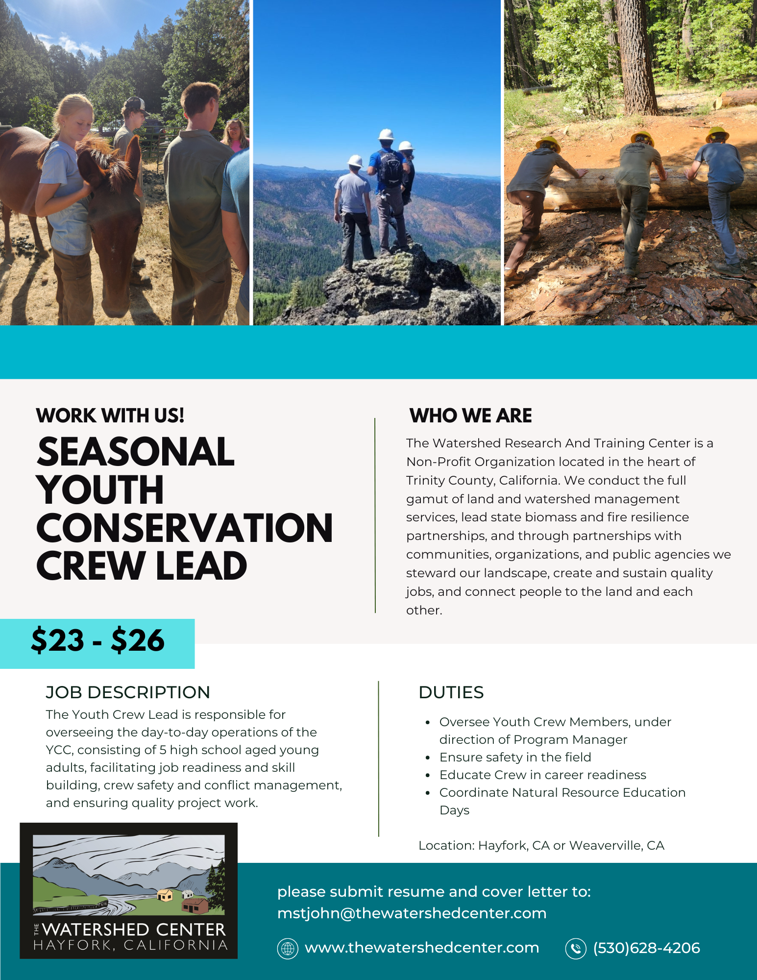 The YCC Lead will lead and mentor the Hayfork YCC, overseeing day-to-day operations while ensuring crew safety and function. The YCC Lead will also demonstrate employable qualities including dependability, attendance, work ethic, stewardship, and respect. Click HERE for the job description and HERE to view the position flier.